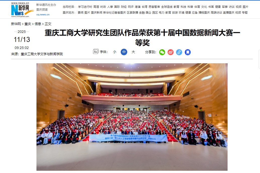 新华网、上游新闻、中国网等媒体分别以《beat365英国官网网站研究生团队荣获第十届中国数据新闻大赛一等奖》进行报道。