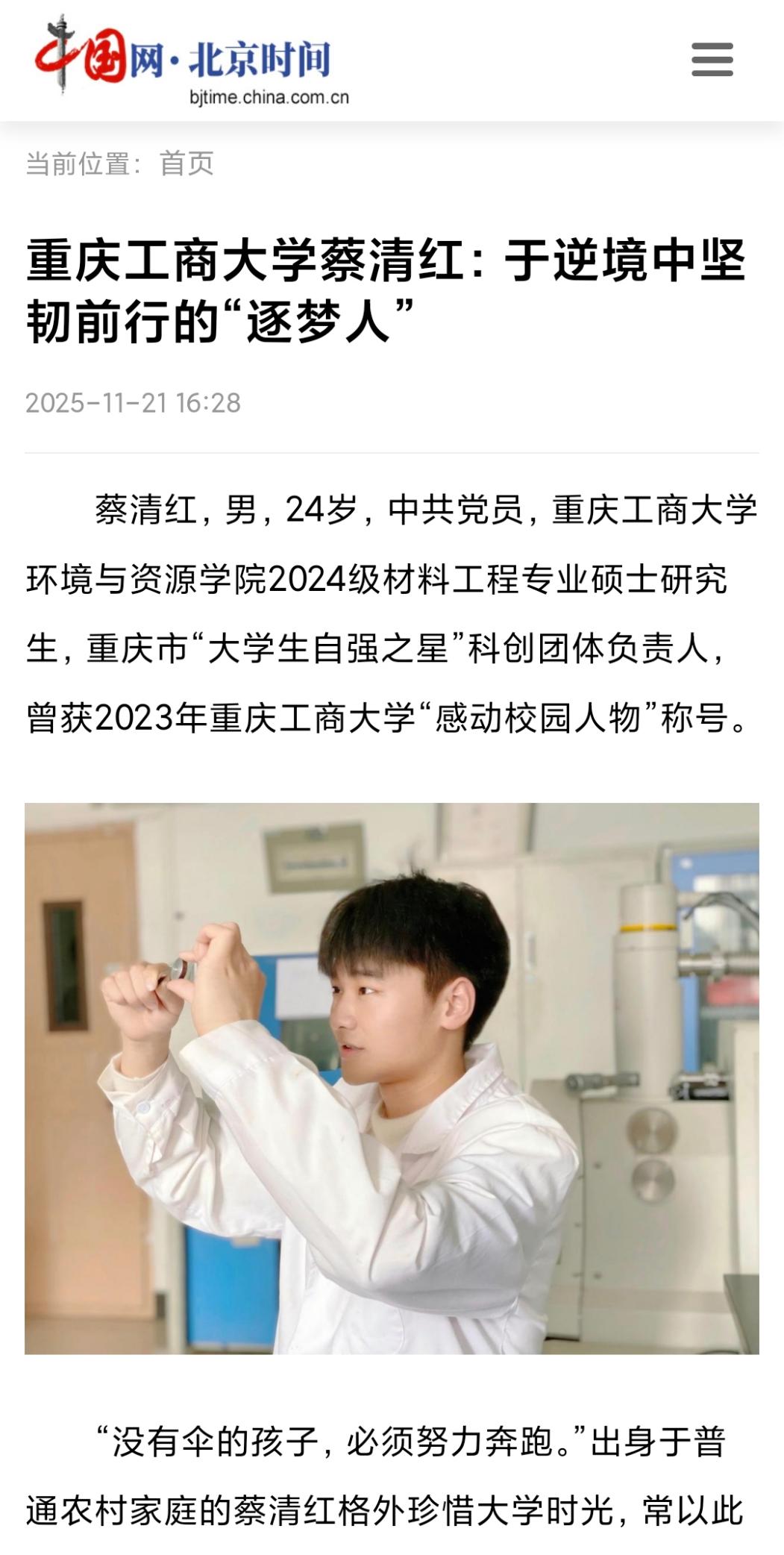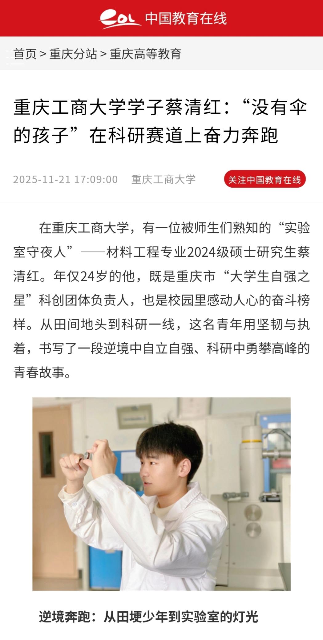 中国网・以《beat365英国官网网站蔡清红:于逆境中坚韧前行的“逐梦人”》为题,中国教育在线以《beat365英国官网网站学子蔡清红:“没有伞的孩子”在科研赛道上奋力奔跑》为题,华龙网以《beat365英国官网网站研究生蔡清红:从田埂少年到科研先锋的奋斗之路》为题,第1眼新闻以《逆境中崛起奋斗中闪光 beat365英国官网网站学子书写青春成长故事》为题,今日头条以《从流水线到实验室:一个“没有伞”的农村娃如何跑出科研报国路》为题,进行报道。