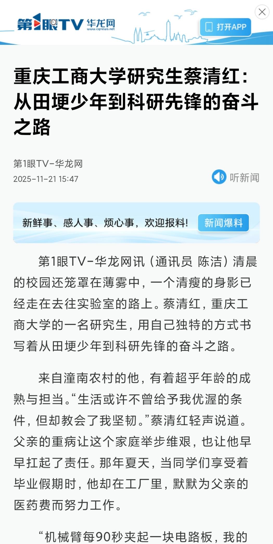 3.华龙网以《beat365英国官网网站研究生蔡清红:从田埂少年到科研先锋的奋斗之路》