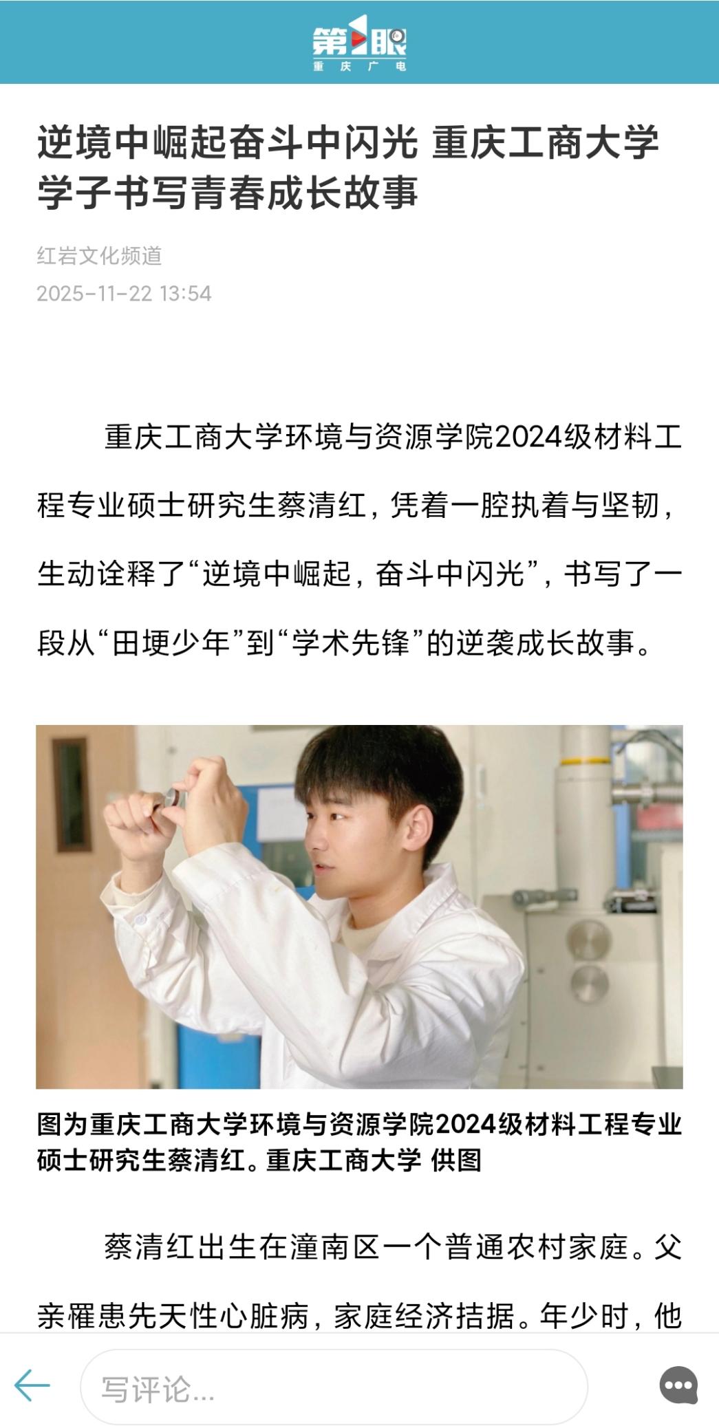近日,beat365环境与资源学院2024级材料工程专业硕士研究生蔡清红的成长故事引发关注。这位从潼南农村走出的“田埂少年”,凭借执着与坚韧突破逆境,在学术科研与社会服务中绽放青春光彩,成为新时代青年奋斗的鲜活典范。