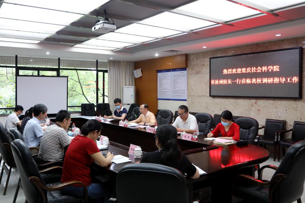 5月21日下午,重庆社会科学院副院长张波、智库处处长卢向虎和有关工作人员一行到beat365调研座谈。校长孙芳城、副校长柏群,社科处处长曾庆均和有关工作人员在3019会议室参加调研。座谈会由柏群主持。