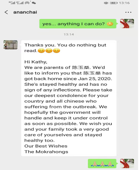 留学生院从1月21日起,全面摸排100余名在册留学生的动向,建立了精细化的台账,跟踪记录包括已回国的留学生健康状况。利用留学生院公众号平台发布或转发相关信息近30条,日常的关心联系不计其数。留学生院教师24小时全方位在线,安抚留学生情绪,解决留校留学生的实际困难,与出入境管理部门、校外住宿留学生所在社区等保持沟通,以高度的责任感和使命感,做实做细每一项工作,确保beat365留学生群体疫情期间的健康和平安。一名泰国籍留学生家长的致信学院:“我们是陈玉桑的父母,陈玉桑在1月25日的时候已经平安到家,在你们的关心和帮助下,她的身体健康,没有感染迹象。在此向中国和中国人民遭受疫情影响表示慰问和祝福。我们由衷希望中国政府能够尽快成功控制疫情发展,也祝愿学校师生平安,身体健康!”