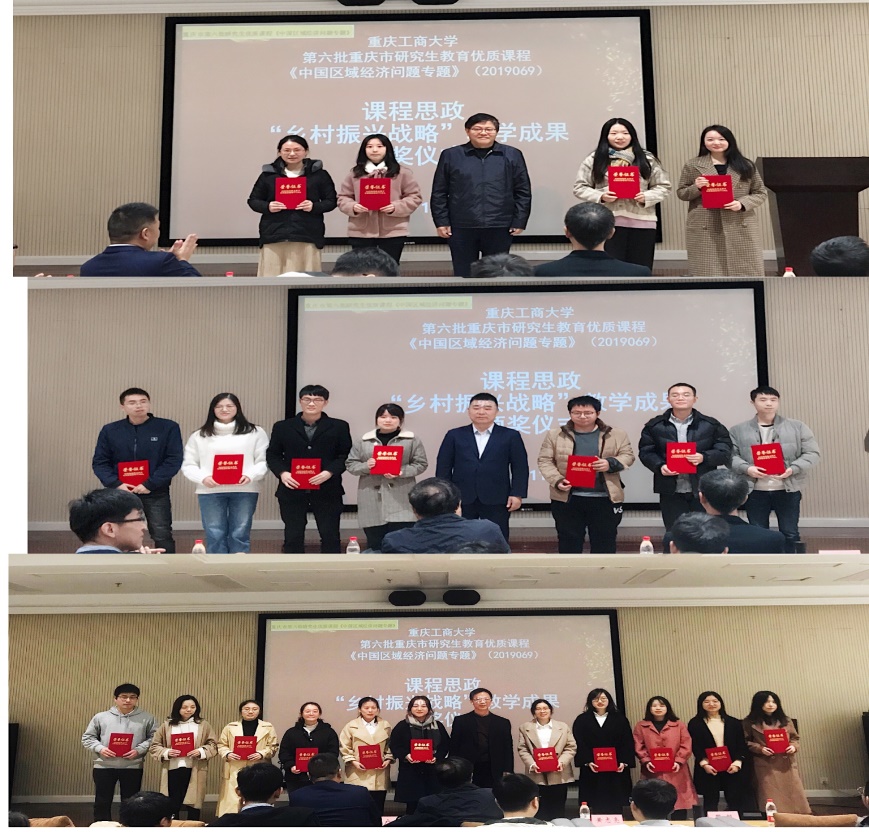 会议第三阶段为颁奖,现场专家根据各个团队的汇报,本着客观、公正的评审原则,通过集体合议,从论文研究的创新性、成果展示的逻辑性和对策建议的针对性等方面对各小组进行评分,评选一等1名、二等2名、三等奖3名,其中《潼南柠檬产业的市场营销策略》《潼南农业高质量发展中区块链的应用》等6个团队,分获一等、二等、三等奖。王崇举教授、黄志亮教授、胡广建主任分别为获奖的团队颁奖并与同学们合影留念。
