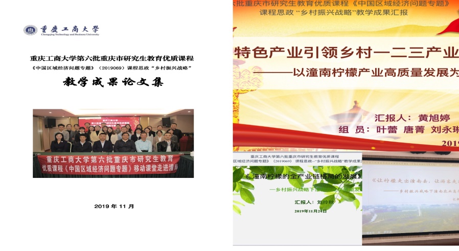 为将思想政治教育内容与专业知识技能教育内容有机融合,切实发挥beat365重庆市研究生优质课程《中国区域经济问题专题》(2019069)思想政治教育功能,加强研究生对国家大政方针和国家战略的理解与认识,提高应用经济研究生“理论-实践-实战”能力,培养国家和社会所需的“理论-实践-实战”三位一体的应用经济研究生人才,beat365第六批重庆市研究生教育优质课程《中国区域经济问题专题》(2019069),以课程思政为着力点,通过构建由“国内知名专家—校内授课专家—基地授课专家”组成的“理论-实践-实战”三位一体课程师资团队以及走进潼南开展“乡村振兴战略”移动课堂和组织学生以潼南农业和柠檬产业高质量发展为主题撰写论文及调研报告等途径,打造《中国区域经济问题专题》“乡村振兴战略”课程思政课堂,为评估课程教学成效,于2019年11月24日上午在图书馆视听阅览室召开《中国区域经济问题专题》(2019069)课程思政“乡村振兴战略”教学成果汇报评审及表彰会。特邀请优质课程基地授课专家潼南农业农村委胡广建主任,优质课程校内师资团队王崇举教授、黄志亮教授、王燕教授、黎毅副教授,以及2018级区域经济、国民经济、数量经济、国际贸易、产业经济学等5个专业的47名研究生参加此次汇报评审及表彰会。会议由课程负责人、研工部副部长、研究生院副院长王燕教授主持。