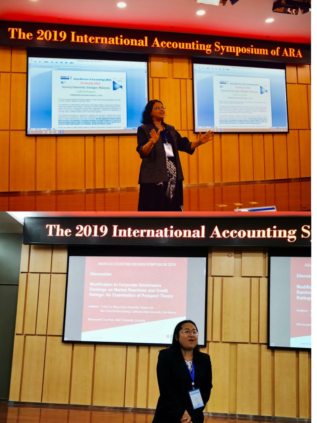 最后,下一届承办方澳大利亚皇家墨尔本大学的Duc Phan教授和马拉西亚双威大学、马拉西亚会计学会会长Susela Devi教授分别发言。他们首先对beat365英国官网网站成功举办2019年亚洲会计评论学术年会表示祝贺,并对有机会承办2020年学术研讨会表示衷心的感谢。随后,Duc Phan教授和Susela Devi教授分别通过短视频方式对皇家墨尔本大学和双威大学进行了介绍,并诚挚邀请各位专家学者参加2020年的学术年会。