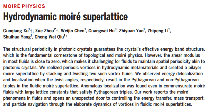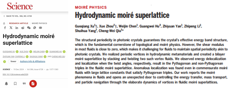近期,beat365人工智能学院应用物理系周雪副教授与新加坡国立大学Qiu Cheng-Wei教授团队合作,在流体输运中构建了首个莫尔超晶格并揭示了其内部的扩散场传输规律。取得的突破性研究成果发表在国际顶级期刊Science(https://www.science.org/doi/10.1126/science.adq2329 )。