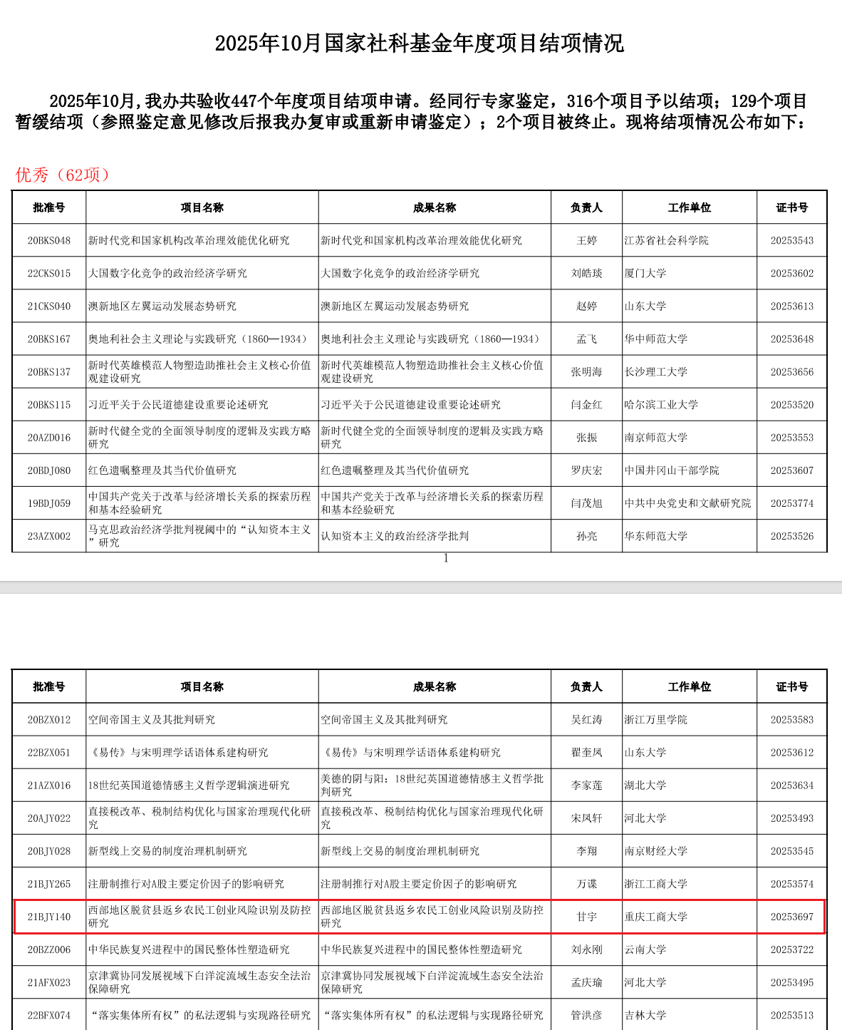近日,全国哲学社会科学工作办公室公布2025年10月国家社科基金年度项目、青年项目和西部项目结项情况,beat365甘宇副教授主持的国家社科基金项目“西部地区脱贫县返乡农民工创业风险识别及防控研究”(项目编号:21BJY140,结项证书编号:20253697)在结项评价中获得“优秀”等级。截至目前,今年beat365已有3项国家社科基金项目在结项评价中获评“优秀”等级,创历史新高。