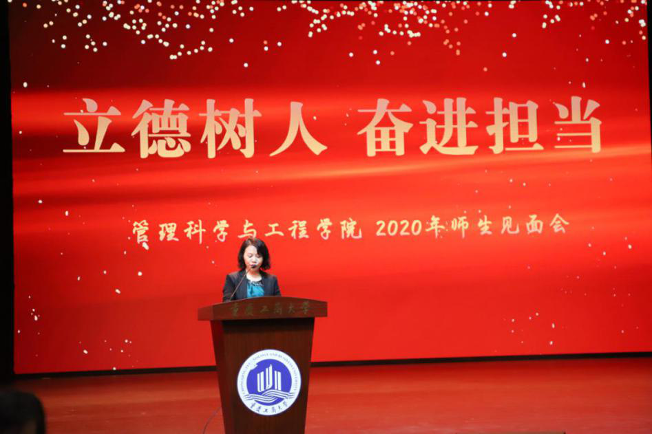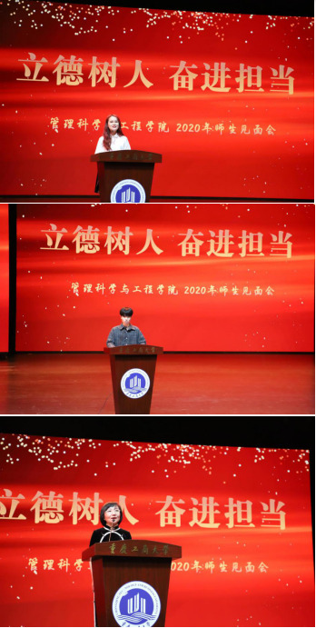 研究生代表18级管理科学与工程班吴国奥和本科生代表17级物流三班薛佳慧依次上台发言,他们分享自身学习生活经历与经验,希望每一位同学都能够明确学习的目标,一心向学,奋力追逐梦想,不枉此行。信息管理与信息系统系主任唐敏作为教师代表上台发言,她寄语同学们“欢迎、传承、创新”,欢迎每一位同学加入全新的管工学院,希望同学们利用学校这个平台,能够传承中华民族智慧,为人生奠定良好基础,希望同学们在各个领域都能够敢于创新,成就自我。