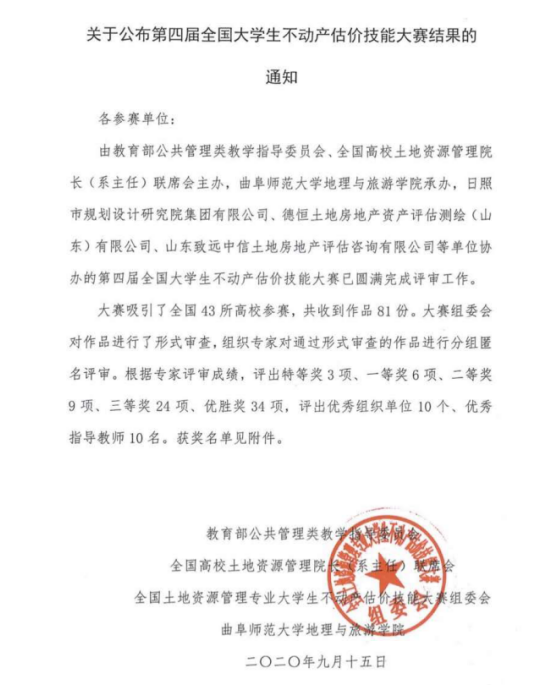 9月16日,第四届全国大学生不动产估价技能大赛圆满落下帷幕。beat365管理科学与工程学院派出1支队伍、共4位队员参加此次大赛,经过激烈角逐,最终获得了优胜奖。