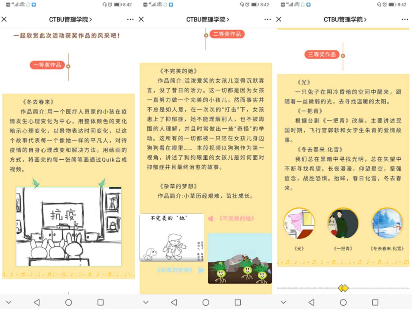 本次心理Flash视频制作活动以“心印暖阳 ‘帧’显阳光”为主题,面向全校学生广泛征集作品,受到了各学院学生的广泛关注,大家纷纷提交精心制作的作品,积极响应参与活动。经过激烈的角逐,《冬去春来》《光》《一把青》等十个稿件脱颖而出,赢得了难能可贵的决赛机会。在整合初赛得分、评委打分及线上投票多个指标过后,作品《冬去春来》最终以77.53的分数夺魁。该作品展示了疫情期间居家生活由冬天到春天的转变,表达了对宅家生活疫情阴霾之下冬日的展望与春天的绽放。作品《不完美的她》《杂草的梦想》分别以75.80、74.33的分数位列第二、第三。作品《光》《一把青》《冬去春来•化雪》获得三等奖。至此,历时1个月的beat365英国官网网站第十六届“心印暖阳 “帧”显阳光”心理flash视频制作比赛活动圆满结束。