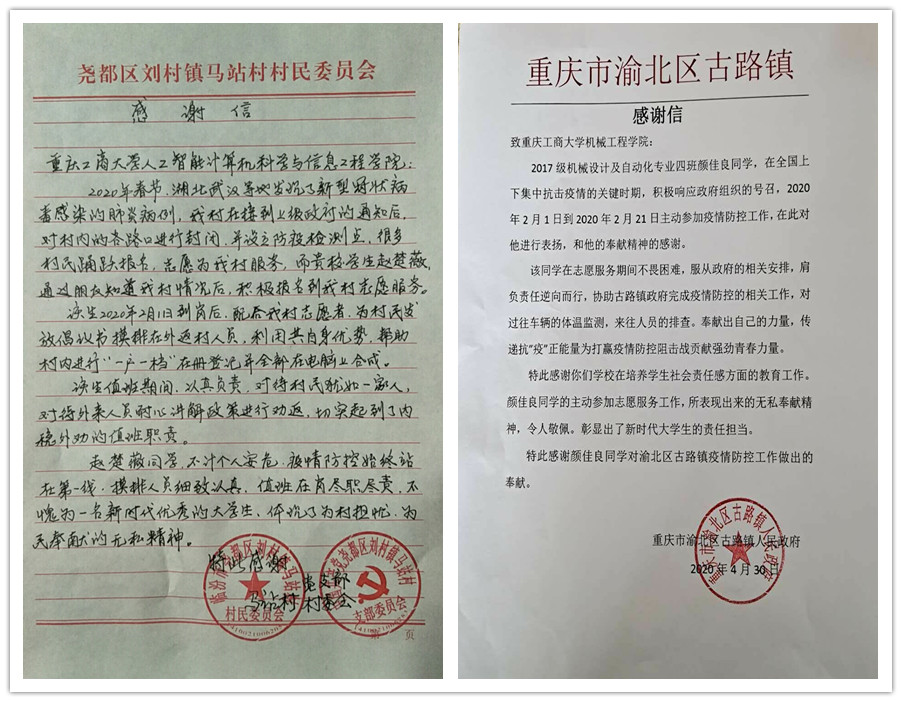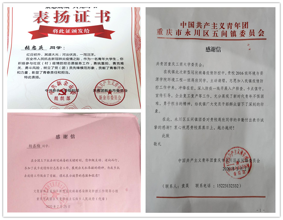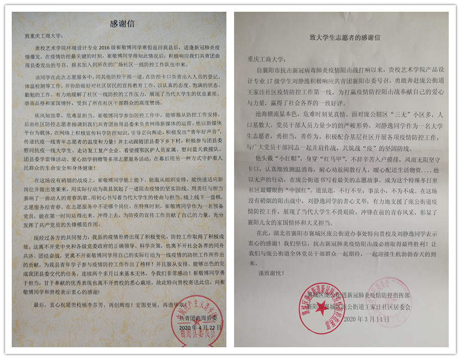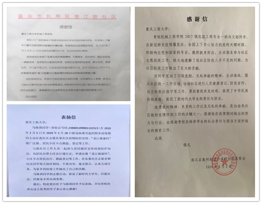 “青春由磨砺而出彩,人生因奋斗而升华”新冠肺炎疫情发生以来,重工商大志愿者们以青春的担当,迅速响应,积极投入,同在一线英勇奋战的广大疫情防控人员一道,不畏艰险、冲锋在前,为夺取疫情防控的胜利注入了鲜活的青春力量。3月以来,beat365陆续收到河北曲周共青团、重庆永川五间镇共青团、重庆渝北区古路镇人民政府、山西临汾尧都区刘村镇马站村党支部等单位寄来的200余封感谢信,对beat365青年在抗“疫”中的表现给予了高度的肯定和赞扬。