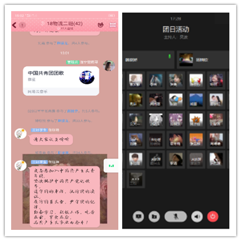 与此同时,18届全体班级也开展了团日活动。其中18级物流二班的团日活动丰富多彩,切合实情。活动的开始,同学们一起听团歌、看入团誓词,观看关于防控疫情的小短片。影片包括硬核防控工作、在疫情期间的温情画面以及各个地区的白衣天使们奋战在一线的拼搏身影……一幕幕画面让大家深受感动,也心生钦佩之情。随后进行了一场知识竞赛,涉及到新型冠状肺炎的正确认识和如何预防等方面。竞赛结束后,团支书组织大家一起观看假期间同学们自愿录制的武汉加油祝福视频。在线上视频会议中,同学们简单分享了“宅家生活”以及今后的学习生活计划。与此同时,同学们进行了为期一周的安全汇报,每天都把自己是否有发烧咳嗽以及体温发送给团支书,此次汇报也利于班委们在这一特殊时期管理好班级的各项事务。