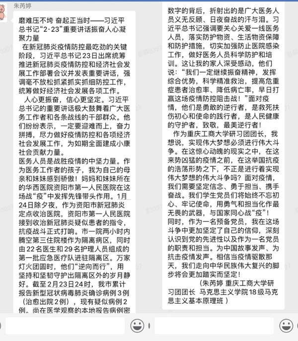 2月23日,习近平总书记在统筹推进新冠肺炎疫情防控和经济社会发展工作部署会议上的重要讲话引起了强烈反响。为贯彻落实习总书记把疫情防控工作作为当前重中之重这一战略部署,2月27日下午,习近平新时代中国特色社会主义思想学生研习团召开了“青春同行,并肩战‘疫’”线上主题团日活动。