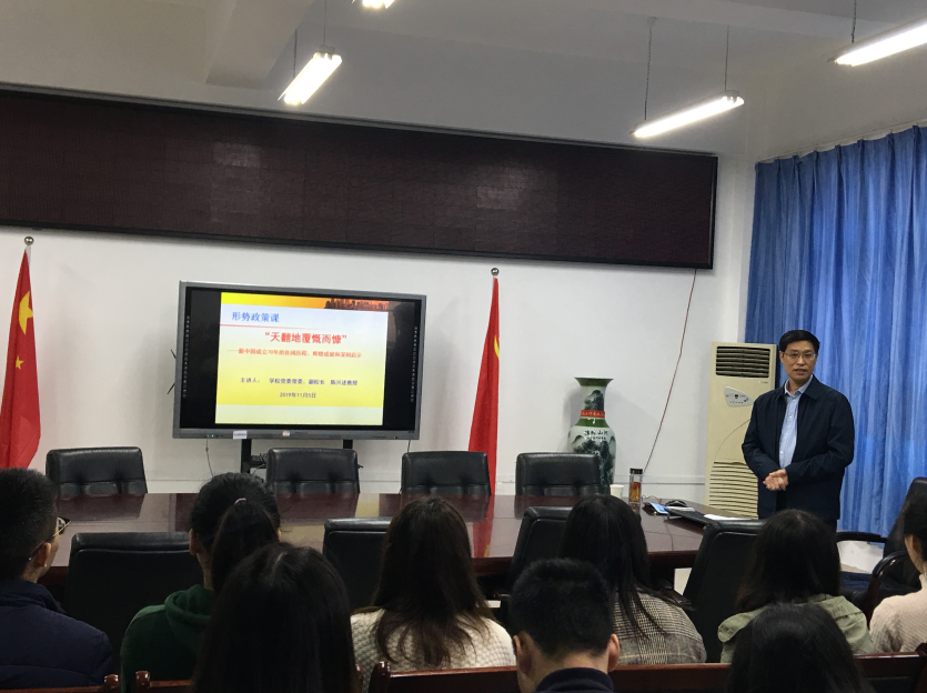 本次授课的内容是建国七十周年来我国发生的翻天覆地的变化。陈兴述副校长引经据典,用大量鲜活的案例将我国70年的发展历程展现在同学们面前,让同学们对新中国的历史和取得的成绩有了更加深刻的认识和体会。
