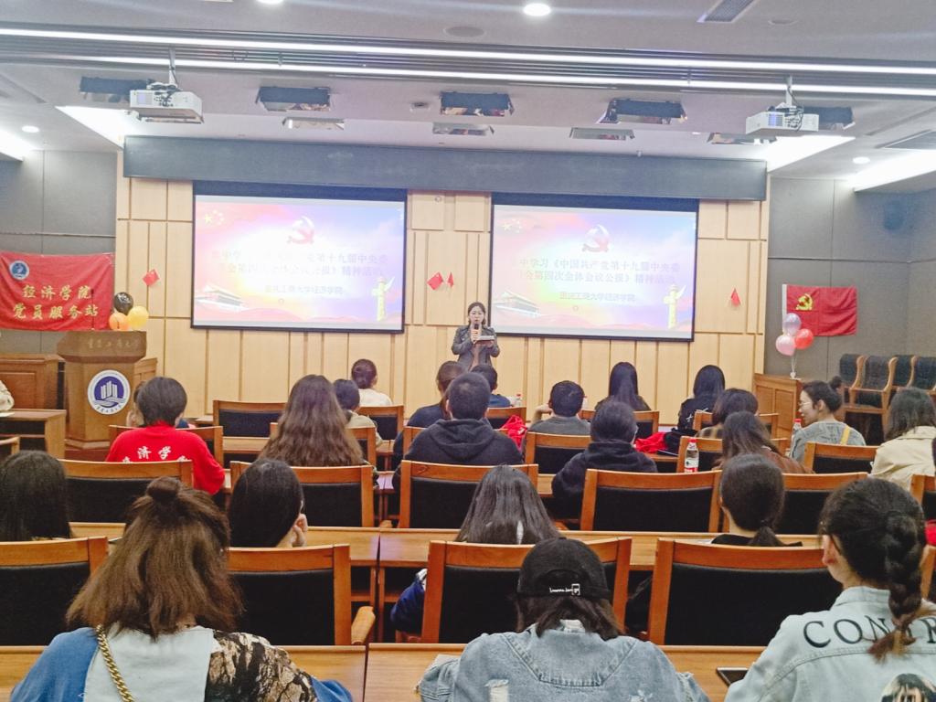 11月4日晚,经济学院党员服务站在新图书馆第一会议室组织开展党员学习活动,传达学习党的十九届四中全会精神,本次活动由学院副书记于频主持,近百名学生党员参加了学习。