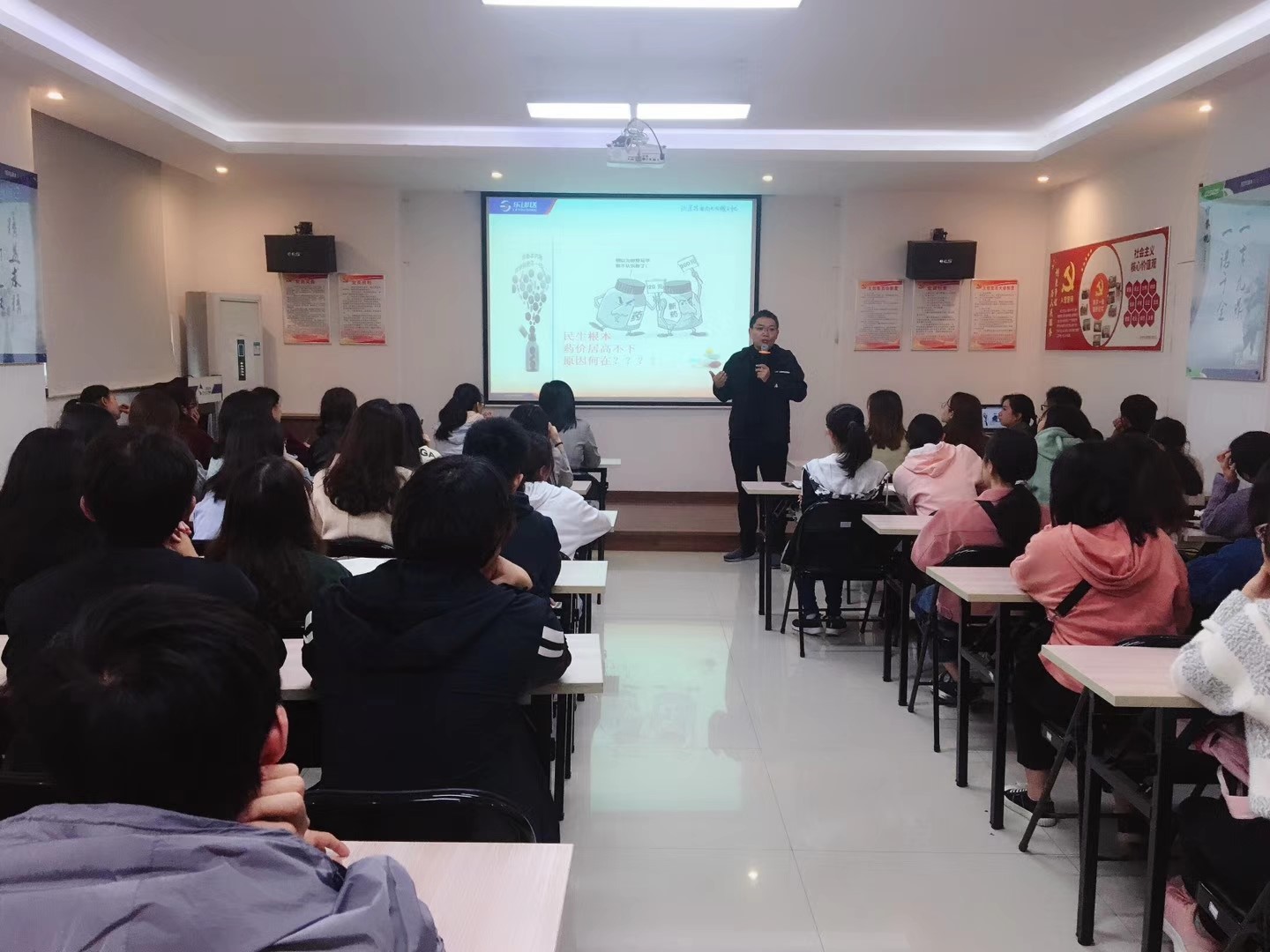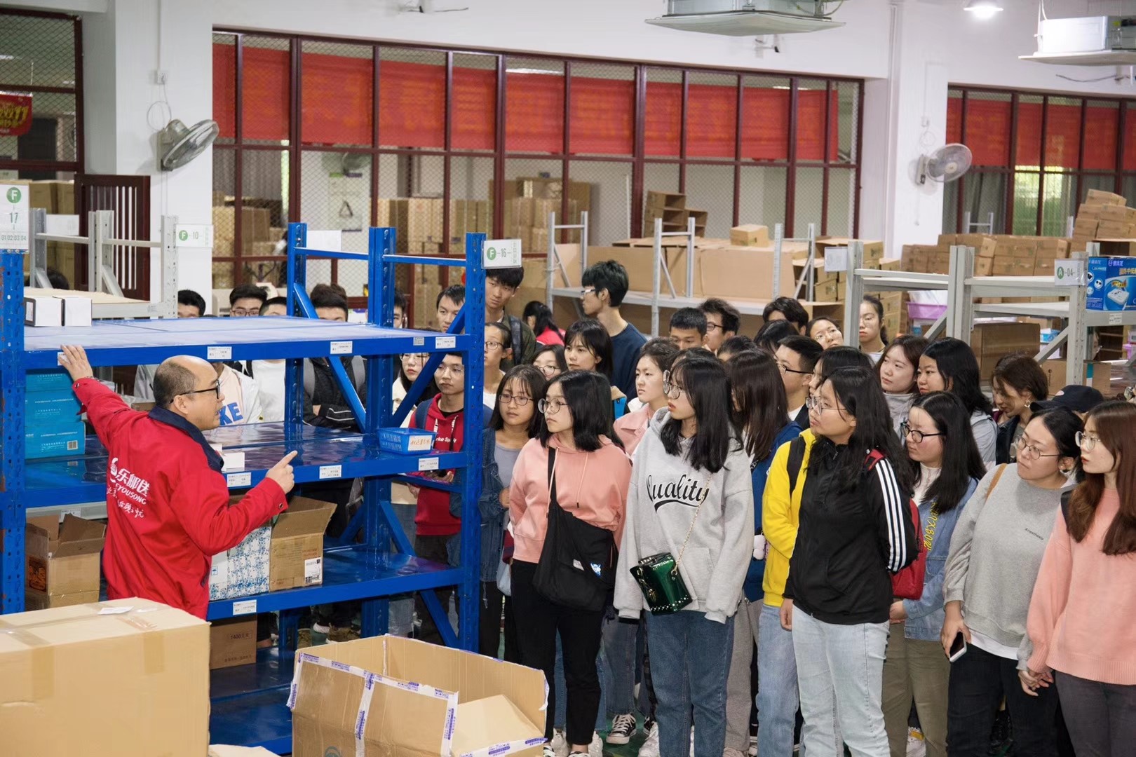 此次移动课堂主要分为三个阶段,第一阶段是任志鸿董事长授课。在介绍加加林公司企业发展的基础上,结合公司物流配送——乐邮送,以多个案例为同学们讲授和诠释了“物流在商业发展中的重要意义”,并对物流管理专业学生应该具备的能力以及未来发展做了提出了高贵的意见和建议。第二阶段为互动交流环节。学生就“物流与商业发展”方面存在的困惑以及对加加林企业未来发展,与任总进行了互动交流。第三个阶段为参观学习。全体同学在“加加林控股”仓储经理的带领下,参观了企业的物流仓储仓库及配送系统,真实的让同学们见识和感受了消费者从下单开始到最后快递公司配送、从仓库货物堆放到取货拣货的全过程,将原来在书本上学到的理论知识有效的在实践进行了检验。