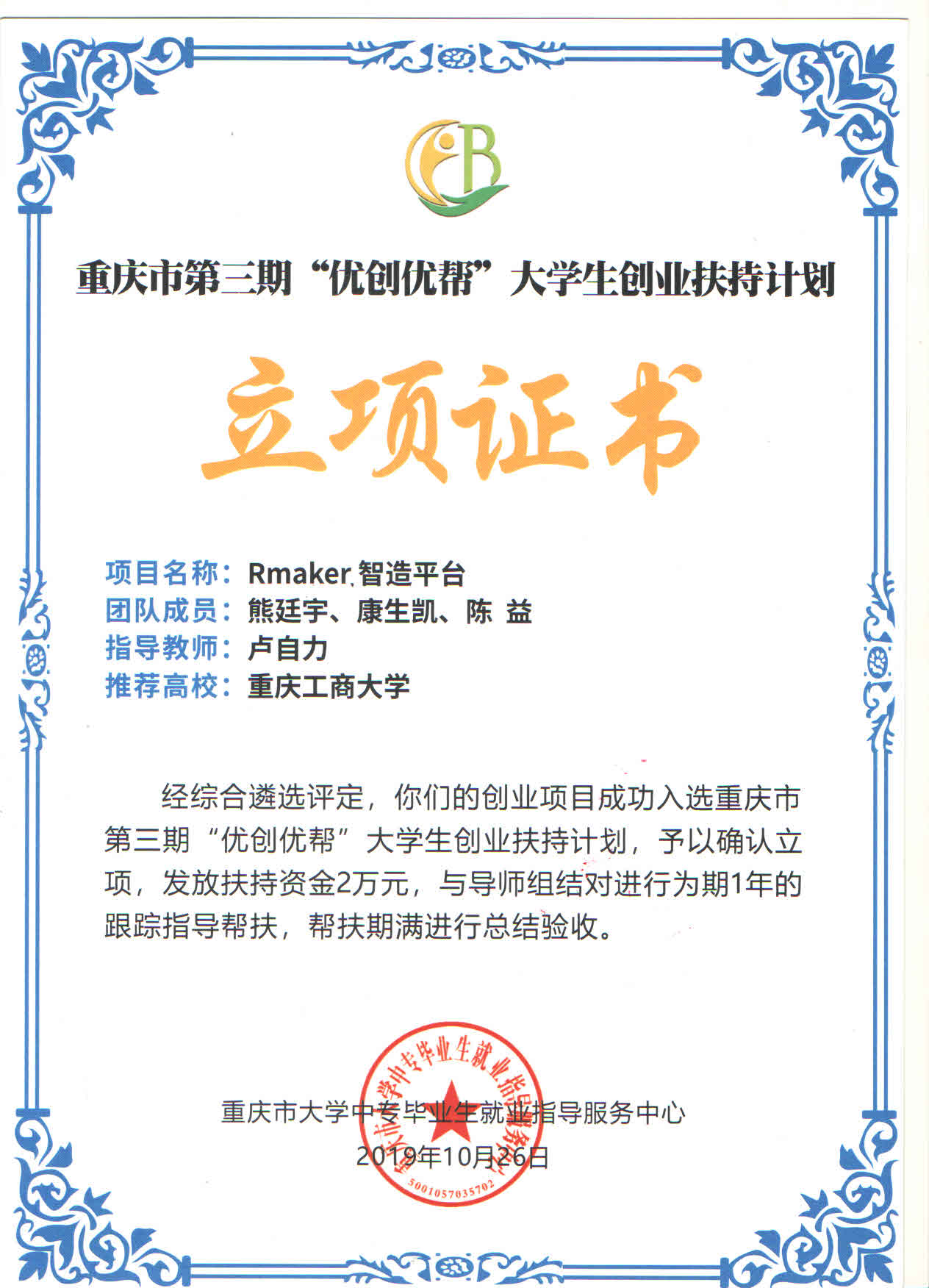 在刚刚结束的重庆市大学中专毕业生就业指导服务中心举办的第三期“优创优帮”大学生创业扶持计划市级总评审中,beat365计算机信息工程学院2016级在校生熊廷宇团队的创业项目“RMaker制造平台”和财政金融学院2016级在校生叶娅楠团队的创业项目“一种超高黑度实用型墨汁”获得创业扶持资助。