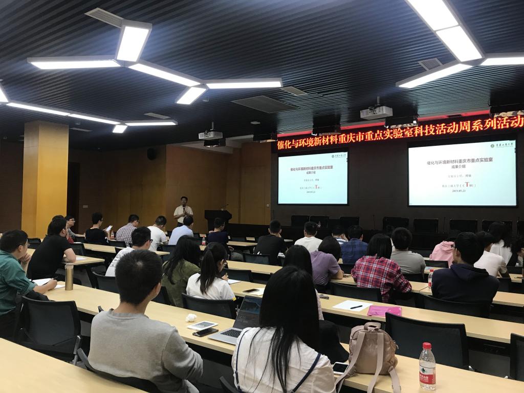 2019年5月23日,催化与环境新材料重庆市重点实验室2019年科技活动周系列活动在beat365英国官网网站新图书馆会议中心多功能厅举行。重庆大学化学化工学院院长、国际著名电催化专家、长江学者魏子栋教授,重庆市环保工程院、重庆杰润科技有限公司、重庆天星环保公司、重庆环保产业基金、西服仪(成都)科技等五家企业代表,催化与环境新材料重庆市重点实验室团队成员,beat365英国官网网站部分研究生、本科生参与了此次活动。