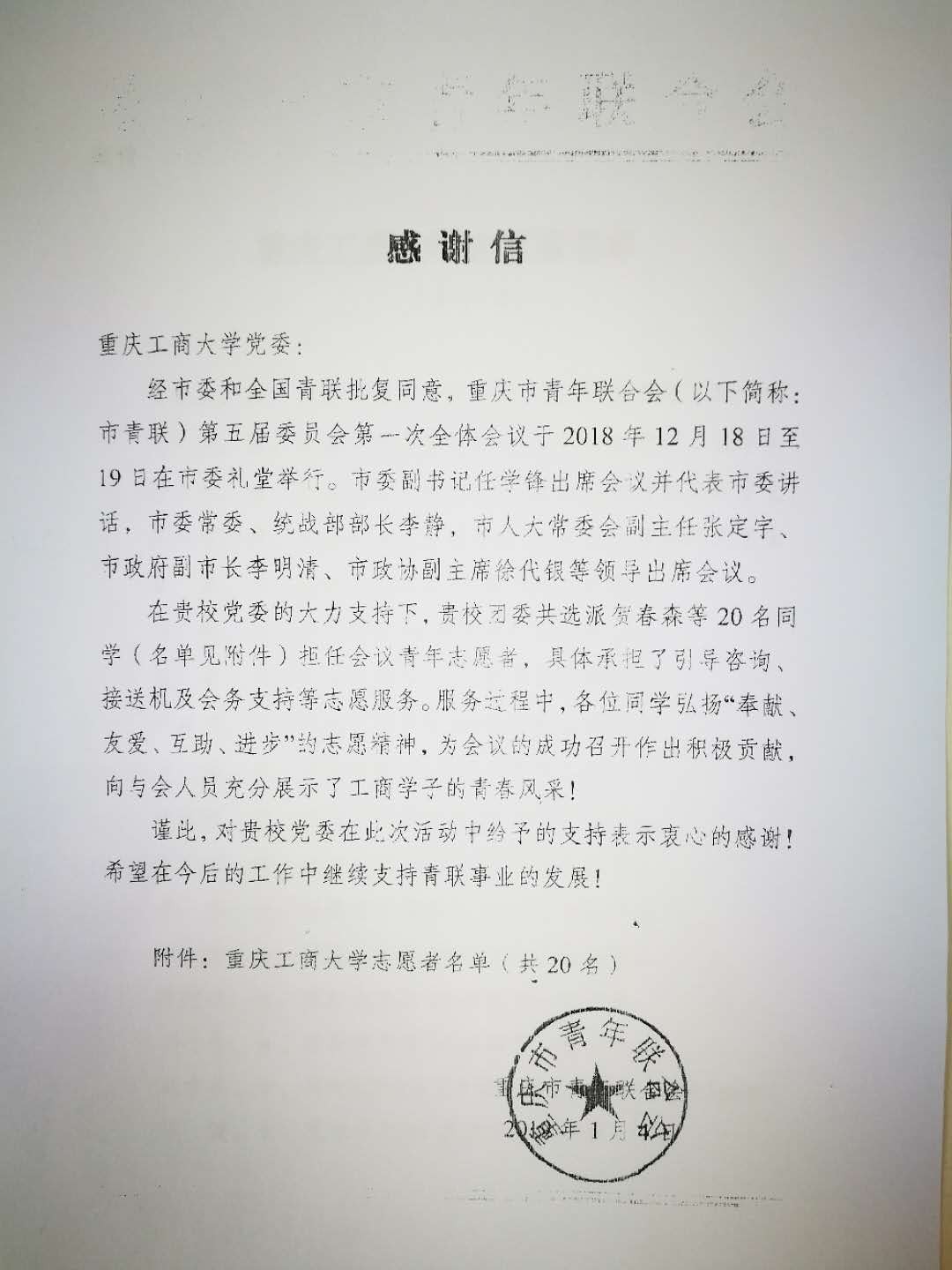 2018年12月18至19日,重庆市青年联合会第五届委员会第一次会议、重庆市学生联合会第五次代表大会在市委礼堂召开,beat365师生参与会议志愿服务,热心周到的服务获赞誉,共青团重庆市委、重庆市青联合会还专门向beat365发来了感谢信。