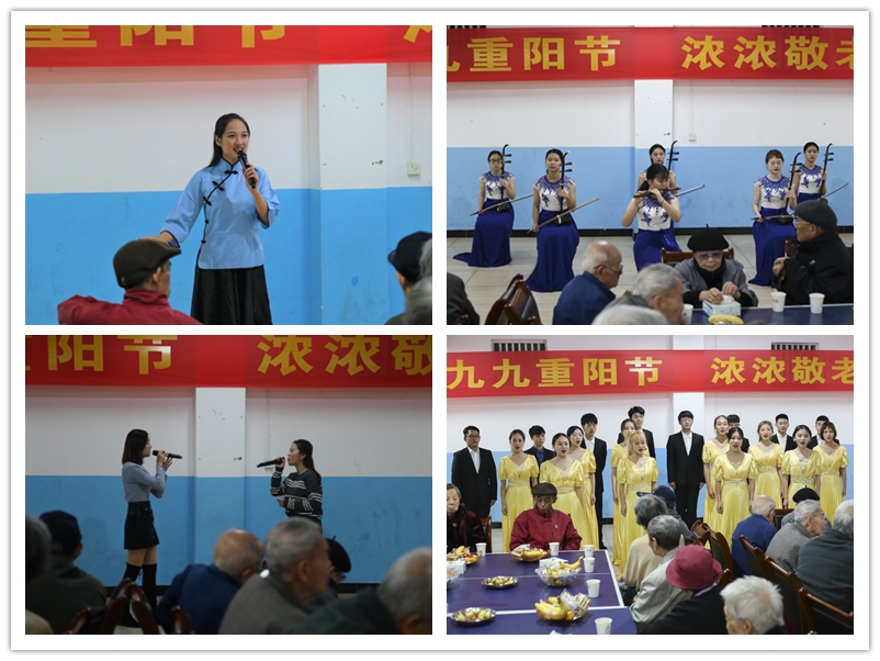 活动伊始,古稀老人蔡鸣泉为大家献上了一首原创诗歌,一字一句、慷慨激昂,向大家展示了特别的精神风貌和感人肺腑的精神力量。随后,大学生艺术团的团员们精心准备的节目纷纷上演。合唱分团一首合唱《绒花》婉转悠扬,把老人们带回到青春芳华的年代,随着回忆的纷纷浮现,老人们洋溢出了灿烂的微笑;民乐分团、管乐分团和舞蹈分团合作的《九儿》、《牧民新歌》和《赛马》,中西结合,给老人们带来了听觉和视觉的享受;歌曲串烧《敢问路在何方》、《滚滚红尘》和《一杯美酒》既唱出了老人们年轻时梦想的远方,又唱出了往日时光的美与好;播主团的同学们带来的诗朗诵《沁园春*长沙》气势磅礴、铿锵有力,带领老人们回到了青春激昂的岁月;舞蹈分团带来的《卓玛》和《月之花语》,月下呢喃、绰约多姿,老人们深深沉醉在曲子和舞蹈的完美结合中。