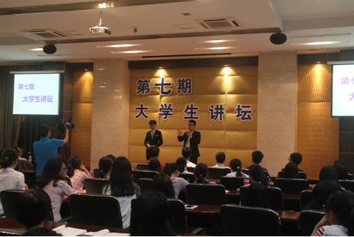 讲坛上,来自商务策划学院2011级策划2班的孟龙学长以自己在校的学习经历,在学校社团组织里的锻炼经历,在社会中的求职经历为线索,以“读大学,用实力让情怀落地”为主题为我们描述了一个别样的大学天堂。他真诚的谈到,人生就像水杯,成长如杯中之水,在加水的过程中,要忍受不被别人垂青的寂寞和空虚,要忍受别人不看好和诋毁的委屈和苦痛,但总有一天,当水加满的时候,你的成功和自豪自然流露,为世人所接受和肯定。他认为,读大学不仅是我们学习知识和常识的一种途径,更是我们学习和培养正确的世界观和方法论的重要途径。在这个途径中,我们需要良好心态支撑,灵活的思想观念指导,并奋起拼搏、坚持不懈。