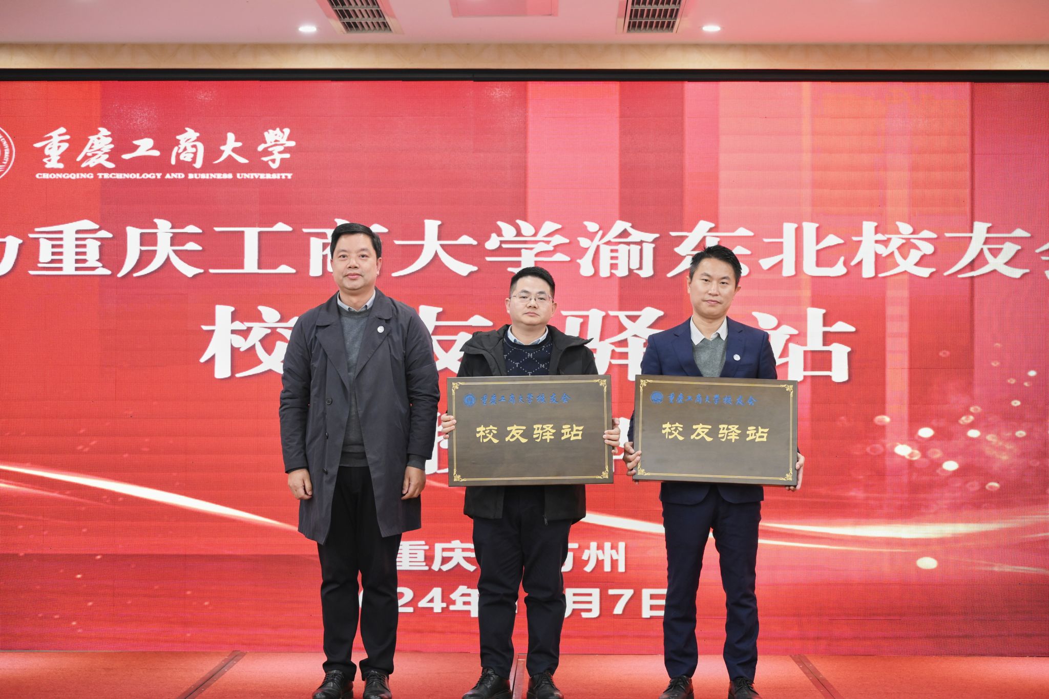 学校校友会副会长赖家国为渝东北校友会校友驿站授牌。
