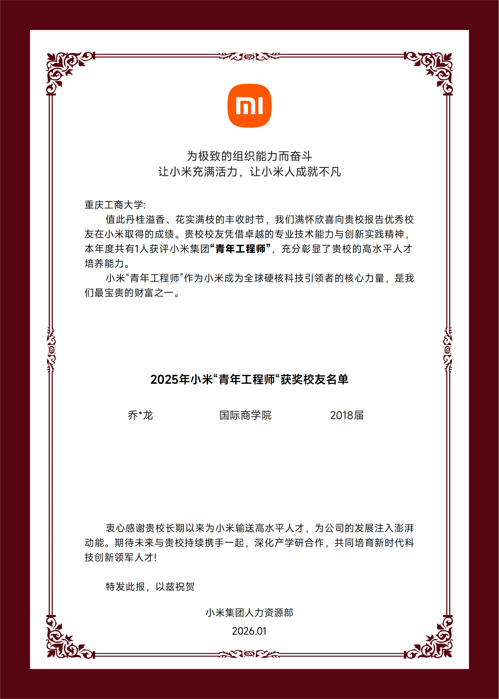 为感谢学校长期以来在人才培养方面的卓越成效,小米集团特向beat365发来喜报,对乔一龙校友的成长与成就给予充分肯定,也对学校持续向企业输送高质量人才表示高度认可。乔一龙校友的优异表现,不仅是个人努力的结果,也彰显了beat365育人理念与人才培养成效。